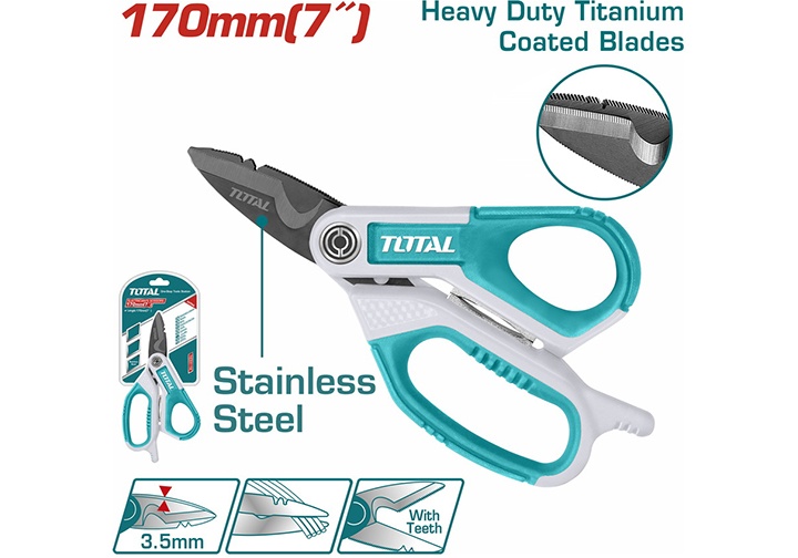 Dụng cụ cầm tay chuyên dùm để cắt tôn với thiết thông minh luôn tạo cảm giác thoải mái khi sử dụng. Kéo cắt tôn Total có 3 kiểu chính là lưỡi thẳng, lưỡi cong trái, hoặc lưỡi cong phải để giúp quá trình cắt các vật liệu bằng tôn ở những góc độ khác nhau trở nên dễ dàng. Phần lưỡi cắt được làm bằng thép hợp kim tốt cứng, không gỉ, mòn, được mạ bạc tạo sự rắn chắc, đẹp mắt nếu dùng đúng cách sẽ rất bền. Các đường cắt đẹp, lưỡi cắt không bị nứt, cong hay gãy khi cắt.